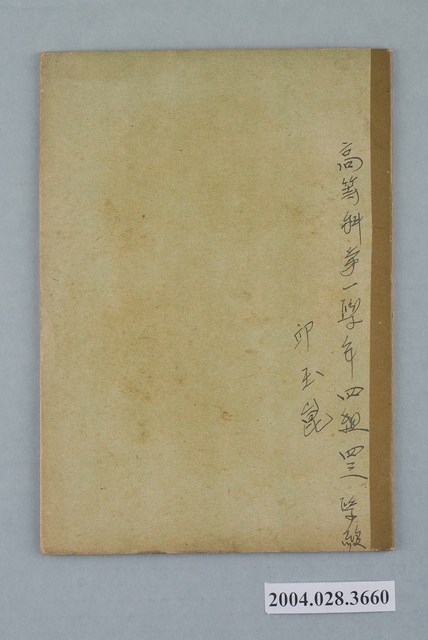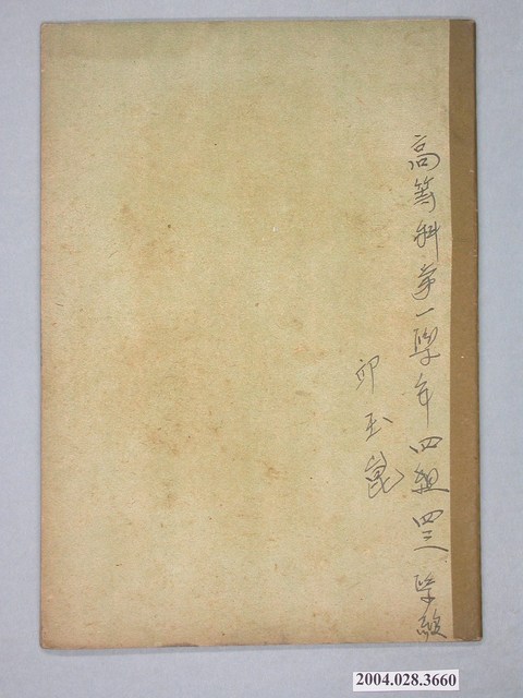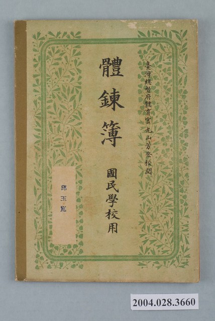 本文物為國民學校用《體鍊簿》,文物封面以綠色花草為設計,可見「臺灣總督府體育官丸山芳登校閱」、「體鍊簿 國民學校用」字樣,左側可見「邱玉崑」之印章,封底可見「高等科第一學年四組四三??邱玉崑」手寫字樣。