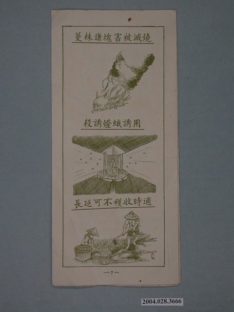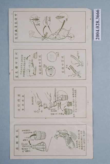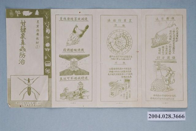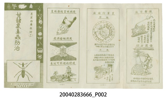 1.本物件為紙本農業宣傳摺頁,頁面周邊有各種農產品及農作物圖案,封面上面有「農業推廣教材(十二)」字樣,並且在中間寫上「甘藷象鼻蟲防治」,最下方有甘藷象鼻蟲圖案。 2.用途:此為農業文宣,主題談論甘藷象鼻蟲防治問題,並有甘藷象鼻蟲圖解,讓民眾更加清楚如何防治。