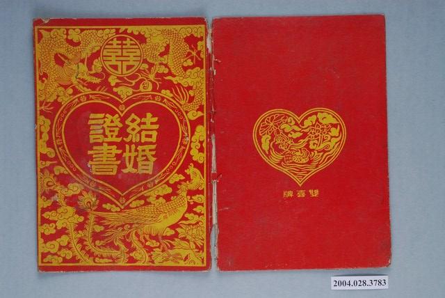 2.結婚證書封面,四緣剝落磨損,表面有磨損與汙損痕跡,以紅底印製黃色龍鳳圖示作為邊框,中間以象徵愛情的心型框著「結婚證書」四字,封底四緣剝落磨損,以紅底印製黃色心型圖示於中央,心中有鴛鴦戲水圖示,底部有「雙喜牌」的商標。封面與封底連接的書脊,出現嚴重剝落,有斷裂的痕跡。