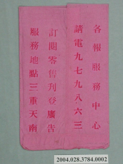 天福獎券行發行的愛國獎券紙套,正面為招財童子圖,上印此期富翁一定是你!!!下印天福獎券行,三重市重新路二段90號(天南書局),邊框上印愛國發財、一舉兩得,保密防諜、人人有責,底印永興承製‧TEL334457。背面印各報服務中心,請電九七九八六三。訂閱零售刊登廣告,服務地點三重天南。