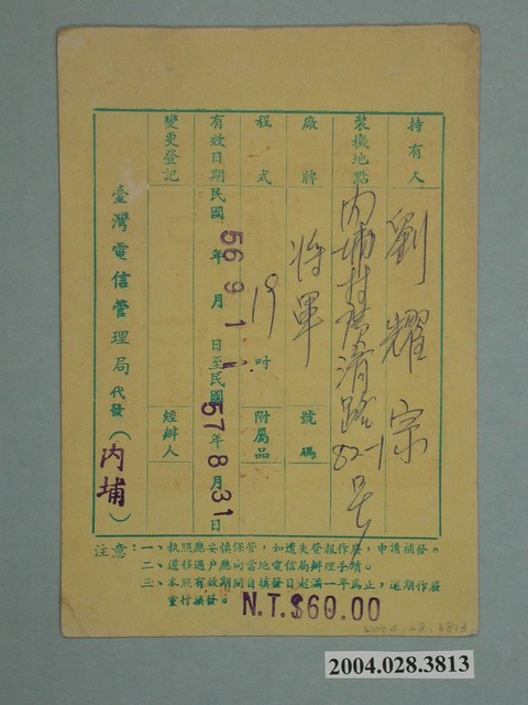 本件為臺灣電信管理局發出之電視廣播接收機執照。正面為「交通部印」關防,背面內容欄說明廠牌為將軍牌19吋電視,裝機地點為屏東縣內埔鄉廣濟路82-1號,裝機費用60元,有效日期自民國56年(1967)9月1日至民國57年8月31日。(編號:丁視字第NO149309)