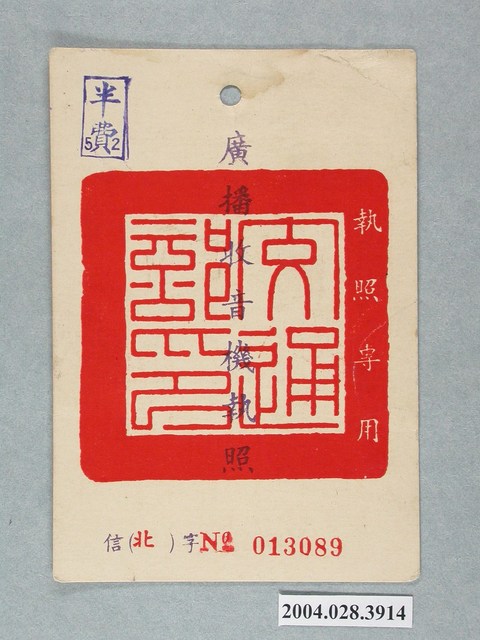 2004.028.3914 民國52年臺灣電信管理局發給徐鳳鳴廣播收音機執照信北字第013089號