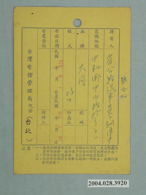 本件正面為「交通部印」關防,左側寫有裝設地點「總務處」。背面內容欄說明此為民國54年(1965)3月1日,臺灣電信管理局代發(代發)給省公路汽車員工訓練中心之電視廣播接收機執照,品牌為大同牌23吋電視,裝機地點為中和鄉中山路75之1號。右側註記「擴音機」三字。