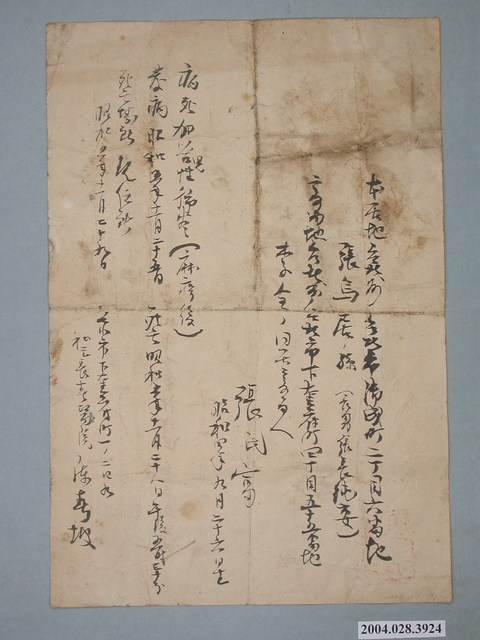 此件為昭和5年(1930)11月29日,由臺北市役所所發出的共同墓地使用許可證,允許申請人李全,住所在台北市下奎府町四丁目55番地,埋葬死屍。使用第一塋區,時間在昭和5年11月29日下午5點30分埋葬。死屍張氏富埋葬於陂子埔共同墓地的使用同意書。