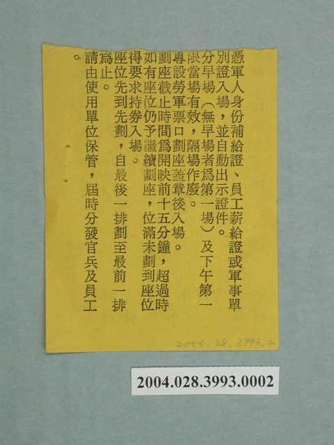 豪華戲院軍人電影票,由中華民國軍人之友社、臺北市軍人服務站印製,雙面印刷。一面上有標示有「75年7月20日」、「下午第一場」、「武昌街二段九十一號」等字樣,蓋印「豪華戲院」,以及手寫註記「4排10號」。另面則詳述該張軍人票之使用方式。本件推測為觀眾於豪華戲院欣賞《衝向天外天》後所蒐集留存之票根。