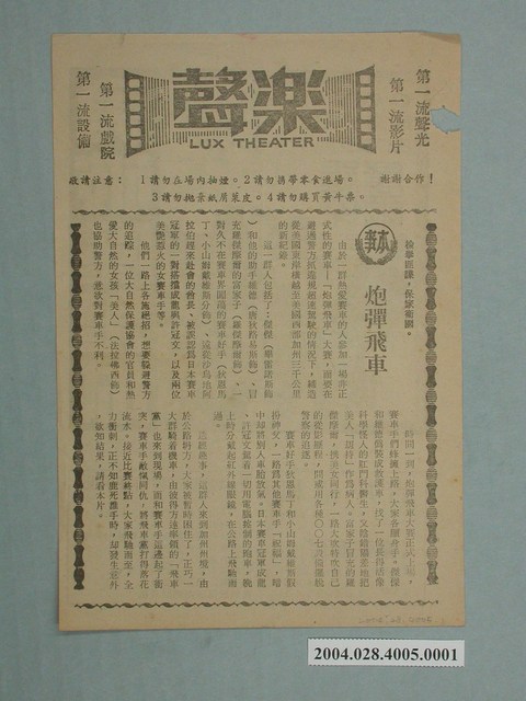 1.臺北樂聲戲院1986年提供觀眾的電影本事,雙面印刷。一面是美國片《炮彈飛車》(The Cannonball Run)的電影本事,描述一群熱愛賽車的車手參與一場非正式之飛車大賽所發生的一連串高潮迭起故事,是一部充滿競技速度感的喜劇片。另面則是下期放映的義大利片《勇破魔鬼城》(Gli esecutori )廣告及劇照,強調該片由知名007影星羅傑摩爾主演,是一部充滿飛天入地下海的激烈火爆動作片。