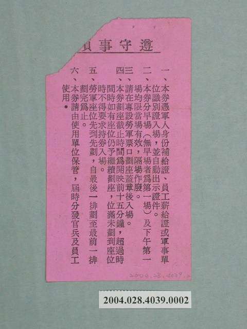 東南亞戲院勞軍入場券,由中華民國軍人之友社、臺北市軍人服務站印製,雙面印刷。一面上有標示有「東南亞戲院」、「勞軍入場券」、「No 0200018」、「日期:75年2月16日」、「地點:羅斯福路四段一三六巷三號」、「下午第一場」等字樣,以及手寫註記樓上「6排13號」。另面則詳述使用該張軍人票之遵守事項。本件推測為觀眾於東南亞戲院欣賞《穿梭三千年》後所蒐集留存之票根。