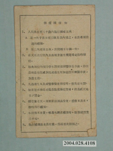 本件為臺中衛生院林富子種痘證,林富子生於民國32年10月11日,地址於臺中市東區振興里第11鄰。背面為種痘種須知,從出生至20歲內施行種痘5次,避不種痘或偽造填種逗證者,處200元以下罰金。種痘為預防天花的一種醫療預防措施,臺灣始於明治29年(1896)總督府制定「種痘手續」為其制度化的開始,明治39年(1906)公告「臺灣種痘規則」,使種痘具有強制力且普及全民。