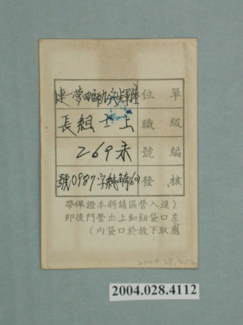 1.本件為「王芳燕大胆識別證」,左上摺皺,保存狀況佳。2.外框為黃色,中央以褐色為主,「大胆」二字為白底粗體紅字,中下有一黃底梅花,中央印了「4」字,下排由左到右分別為名條、照片、證名。名條為手寫直式「王芳燕」,照片為黑白半身脫帽照,政名為白底紅字印刷「識別證」。3.背面四邊磨損,上有數個方形白色痕跡,表格有四,分別為單位「陸軍步兵九師四營一連」、級職「上士組長」、編號「未962」、核發等資訊「(06)奇角純字7890號」。下有說明「(進入營區請將本證佩帶佐帶鈕扣上出營門後即應取下放於口袋內)」。