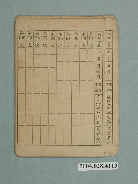 1.本件為「張志明跳傘紀錄卡」,分裂成兩張,正面四緣磨損,上有直式手寫姓名「張志明」、橫式題名「跳傘紀錄卡」,下方為半身脫帽照片,最下方有一表格,欄位有出生「民國 年 月 日」、證書「雄風字第07731號」上有鋼印。2.背面四緣磨損,有一表格欄位有「跳傘次數」、「年」、「月」、「日」、「課目」、「携帶裝備」、「高度(呎)」、「地點」、「主管簽證」,欄位全數留白未填。
