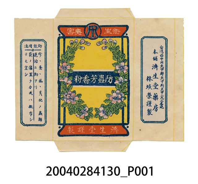 本物件為濟生堂製防蟲芳香粉包裝紙,為紙質,物件以遭拆解攤平,包裝紙正面有1個黃色長方形區塊,其上下各有1個紅色梯形,長方形區塊內有花圈圖案,中央則有「防蟲芳香粉」白色字樣,上方梯形內有圓形商標圖案及「衛生無害」白色字樣,下方梯形內有「濟生堂謹製」白色字樣,包裝紙背面被分為兩小塊,右側有「台灣台中州大甲郡大甲街大甲二九二番地」、「本舖濟生堂藥房」、「林埮榮謹製」深藍色字樣;左側則有「效能」、「用法」、「袗、蚤、虱、其他ノ蟲類退治ニ效アリ」、「袋ノ儘置クカ或ハ撤布シテモ宜シ」藍色字樣。