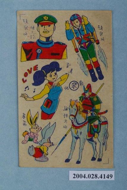 1.臺灣出版彩色人物紋身貼紙,直式單面,共六張,右上角為一個人背著火箭,右邊則是一位士兵,下方則是一位女性在唱歌,旁邊用藍字寫「清美」,右下方則是一位武士身穿鎧甲騎著一匹馬,用藍色網點補齊顏色,右下角則是兩隻兔子,底色因年代而泛黃。2.其他資訊不詳。