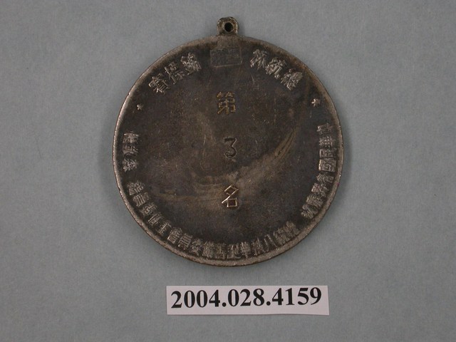 1.本件為「民國五十五年總統八秩華誕總統杯紀念比賽第3名獎牌」,正面磨損掉色嚴重,此獎牌為圓形,上有凸起孔洞以供吊掛。正面有五層文字,第一層為「總統八秩華誕」、第二層為「總統杯紀念比賽」、第三層為中華民國國旗、第四層為題款「萬壽無疆」、第五層為「五十五年」。2.背面磨損嚴重,「第3名」直式置中,以文字環繞圓周,中間有一白文壘球二字,左、右分別為「總通杯」、「錦標賽」,底部一行字為「中華民國各界慶祝 總統八秩華誕籌備委員會主任委員楊 森敬贈」。
