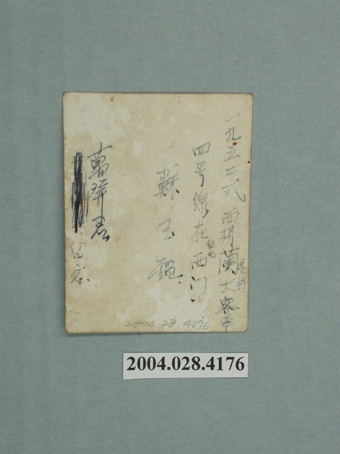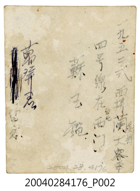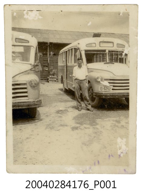 本物件為一男子與兩臺公共汽車之合照,其中位於男子左側的車牌號碼為I5-6252,該樣式為西元1949年至1975年所用樣式,公共汽車後為一平房,背面填寫有一九五二式西拂蘭受持大客車四號線在台北西門蘇玉鑑萬發君留念字樣。