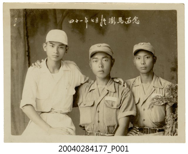 1.本物件為三位著軍裝青年於澎馬留念合照,物件為黑豹照片,畫面中有3位軍裝戴著帽子的少年,物件左邊的兩位少年互相將手搭於對方的肩上,物件背面有藍色手寫字跡。