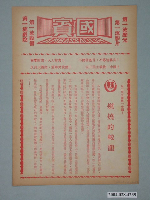 1.臺北國賓戲院1980年代提供觀眾的電影本事,雙面印刷。一面為美國電影《燃燒的蛟龍》(Avenging Force)的電影本事,描述一名身手不凡的前中情局探員歸鄉照顧妹妹及朋友,卻遭遇一連串殘酷暴力追殺的故事。另面則是下期上映的《衝鋒追魂手》(Mad Max)的電影劇照及文案廣告,該片由喬治米勒執導,知名男星梅爾吉勃遜飾演男主角瘋狂麥斯,騎著馬力十足的機車與惡徒展開生死決鬥的故事。