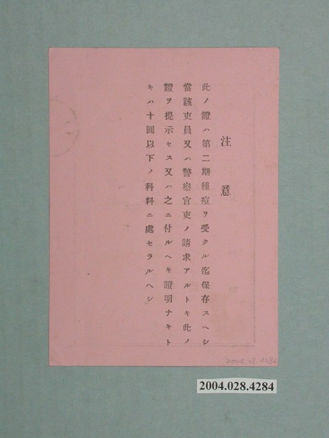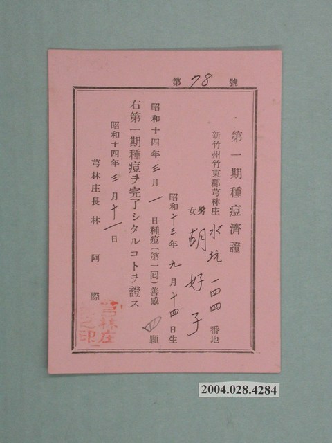 2004.028.4284 昭和14年胡好子第一期種痘證