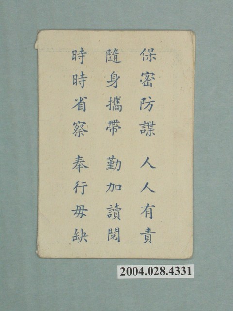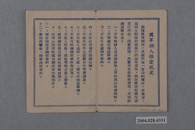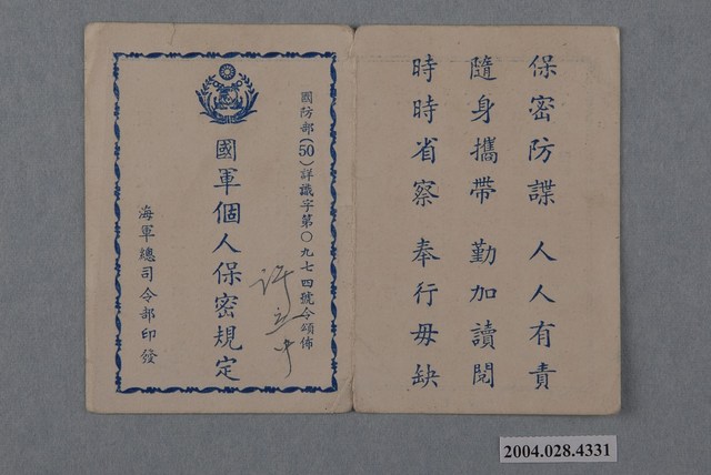 本件為海軍總司令部印發「國軍個人保密規定」,白紙藍字,國軍單摺宣導紙張,國防部(50)詳識字第0974號頒布,內容說明維護軍事機密,是國軍每一官兵的責任,詳列12條保密規定事項。