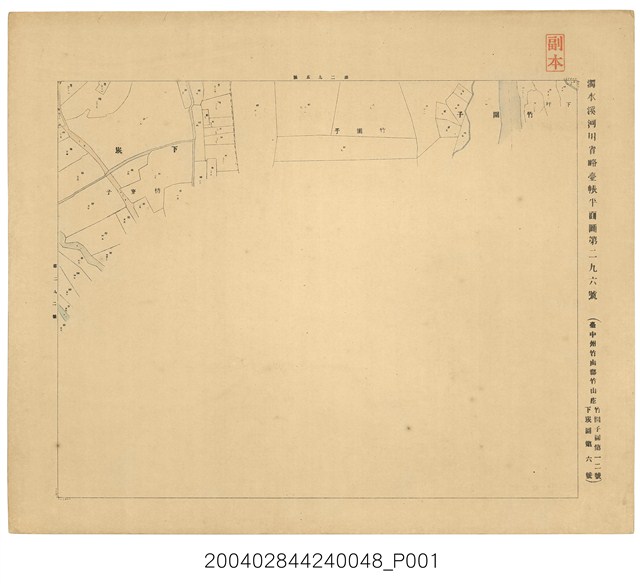 本圖為《濁水溪河川省略臺帳平面圖 》之一幅,比例尺二千五百分一,製作者臺灣總督府土木局水利課(或土木課水利股),準用河川省略臺帳平面圖之圖號為「濁水溪河川省略臺帳平面圖第二九六號」,依據地租規則之圖號為「臺中州竹山郡竹山庄竹圍子圖第一二號」及「下崁圖第六號」。右上蓋有「副本」方戳。