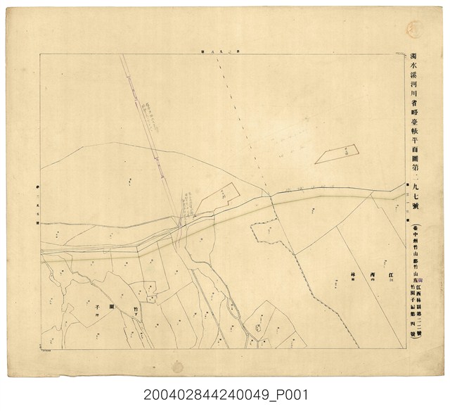 本圖為《濁水溪河川省略臺帳平面圖 》之一幅,比例尺二千五百分一,製作者臺灣總督府土木局水利課(或土木課水利股),準用河川省略臺帳平面圖之圖號為「濁水溪河川省略臺帳平面圖第二九七號」,依據地租規則之圖號為「臺中州竹山郡竹山街江西林圖第二二號」及「竹圍子圖第四號」。右上蓋有「寫」圓戳。