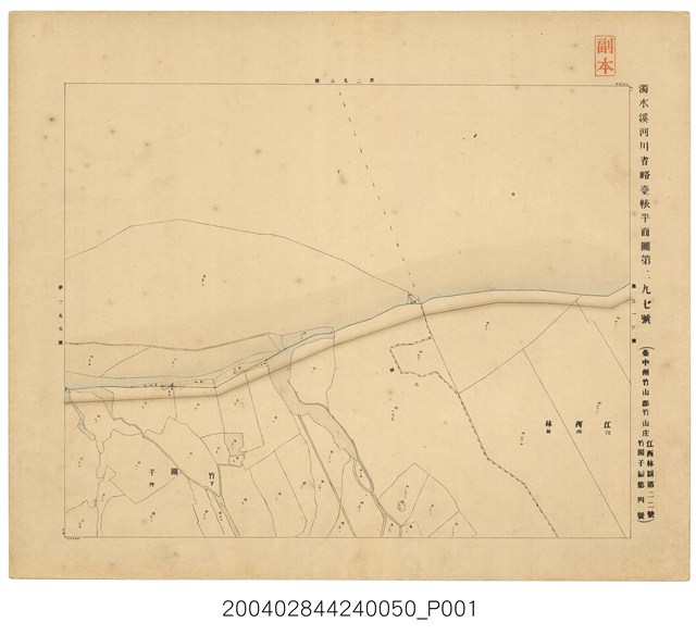 本圖為《濁水溪河川省略臺帳平面圖 》之一幅,比例尺二千五百分一,製作者臺灣總督府土木局水利課(或土木課水利股),準用河川省略臺帳平面圖之圖號為「濁水溪河川省略臺帳平面圖第297號」,依據地租規則之圖號為「臺中州竹山郡竹山庄江西林圖第二二號」及「竹圍子圖第四號」。右上蓋有「副本」方戳。