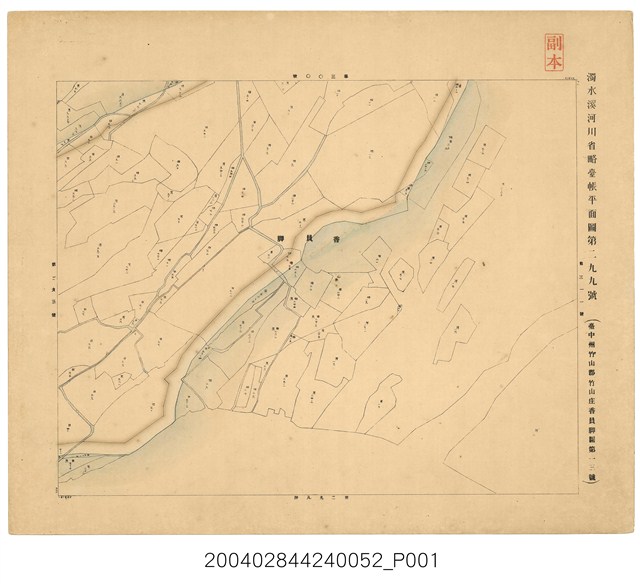 本圖為《濁水溪河川省略臺帳平面圖 》之一幅,比例尺二千五百分一,製作者臺灣總督府土木局水利課(或土木課水利股),準用河川省略臺帳平面圖之圖號為「濁水溪河川省略臺帳平面圖第二九九號」,依據地租規則之圖號為「臺中州竹山郡竹山庄香員腳圖第一三號」。右上蓋有「副本」方戳。