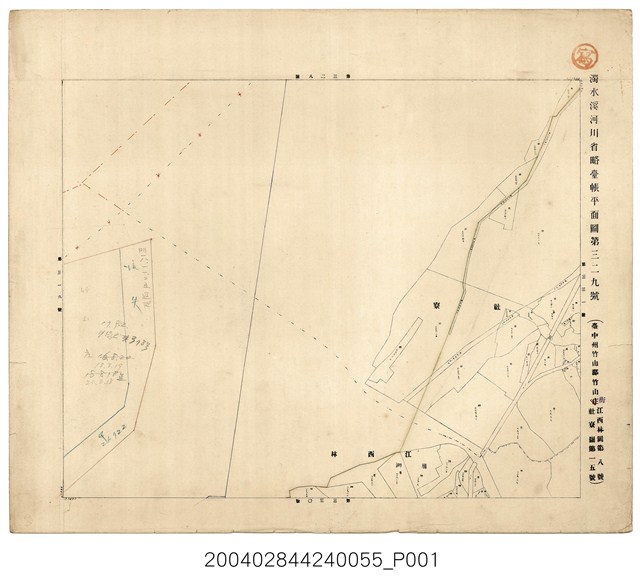 本圖為《濁水溪河川省略臺帳平面圖 》之一幅,比例尺二千五百分一,製作者臺灣總督府土木局水利課(或土木課水利股),準用河川省略臺帳平面圖之圖號為「濁水溪河川省略臺帳平面圖第三二九號」,依據地租規則之圖號為「臺中州竹山郡竹山街江西林圖第八號」、「社寮圖第一五號」。右上蓋有「寫」圓戳。