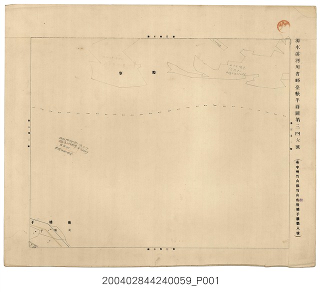 本圖為《濁水溪河川省略臺帳平面圖 》之一幅,比例尺二千五百分一,製作者臺灣總督府土木局水利課(或土木課水利股),準用河川省略臺帳平面圖之圖號為「濁水溪河川省略臺帳平面圖第三四六號」,依據地租規則之圖號為「臺中州竹山郡竹山街後埔子圖第八號」。右上蓋有「寫」圓戳。
