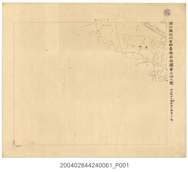 本圖為《濁水溪河川省略臺帳平面圖 》之一幅,比例尺二千五百分一,製作者臺灣總督府土木局水利課(或土木課水利股),準用河川省略臺帳平面圖之圖號為「濁水溪河川省略臺帳平面圖第三四八號」,依據地租規則之圖號為「竹山郡竹山街後埔子圖第一O號」。右上蓋有「寫」紫色圓戳。