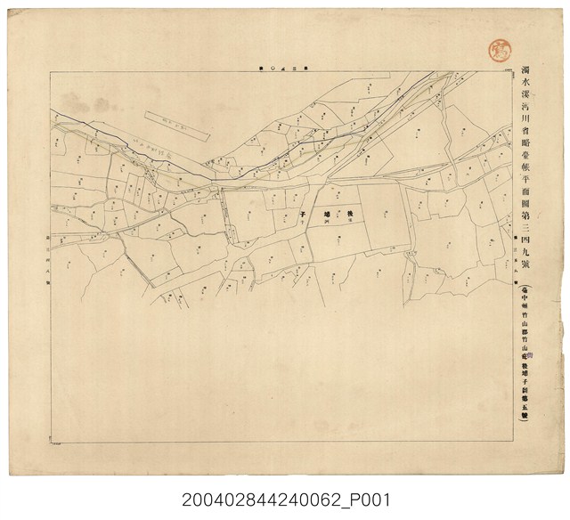 本圖為《濁水溪河川省略臺帳平面圖 》之一幅,比例尺二千五百分一,製作者臺灣總督府土木局水利課(或土木課水利股),準用河川省略臺帳平面圖之圖號為「濁水溪河川省略臺帳平面圖第三四九號」,依據地租規則之圖號為「臺中州竹山郡竹山街後埔子圖第五號」。右上蓋有「寫」圓戳。