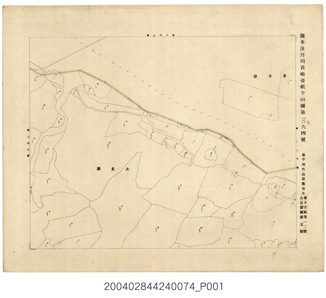 本圖為《濁水溪河川省略臺帳平面圖 》之一幅,比例尺二千五百分一,製作者臺灣總督府土木局水利課(或土木課水利股),準用河川省略臺帳平面圖之圖號為「濁水溪河川省略臺帳平面圖第三六四號」,依據地租規則之圖號為「臺中州竹山郡鹿谷庄番子寮圖第一二號、大丘園圖第七號」。