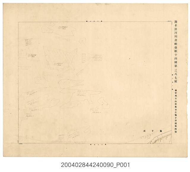 本圖為《濁水溪河川省略臺帳平面圖 》之一幅,比例尺二千五百分一,製作者臺灣總督府土木局水利課(或土木課水利股),準用河川省略臺帳平面圖之圖號為「濁水溪河川省略臺帳平面圖第三八七號」,依據地租規則之圖號為「臺中州竹山郡鹿谷庄龜子頭圖第四號」。