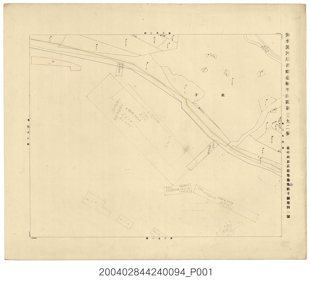 本圖為《濁水溪河川省略臺帳平面圖 》之一幅,比例尺二千五百分一,製作者臺灣總督府土木局水利課(或土木課水利股),準用河川省略臺帳平面圖之圖號為「濁水溪河川省略臺帳平面圖第三九二號」,依據地租規則之圖號為「臺中州新高郡集集街社子圖第四一號」。