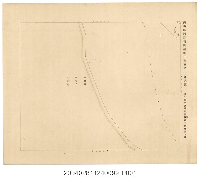 本圖為《濁水溪河川省略臺帳平面圖 》之一幅,比例尺二千五百分一,製作者臺灣總督府土木局水利課(或土木課水利股),準用河川省略臺帳平面圖之圖號為「濁水溪河川省略臺帳平面圖第三九八號」,依據地租規則之圖號為「臺中州新高郡集集街社子圖第三八號」。