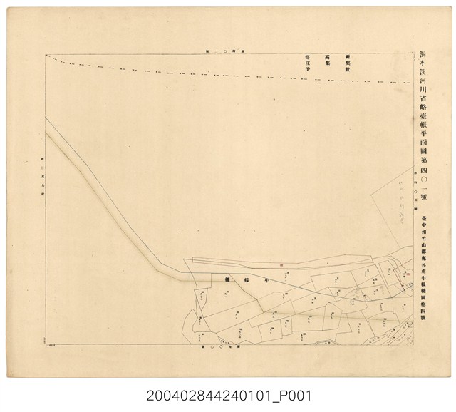 本圖為《濁水溪河川省略臺帳平面圖 》之一幅,比例尺二千五百分一,製作者臺灣總督府土木局水利課(或土木課水利股),準用河川省略臺帳平面圖之圖號為「濁水溪河川省略臺帳平面圖第四O一號」,依據地租規則之圖號為「臺中州竹山郡鹿谷庄牛轀轆圖第四號」。