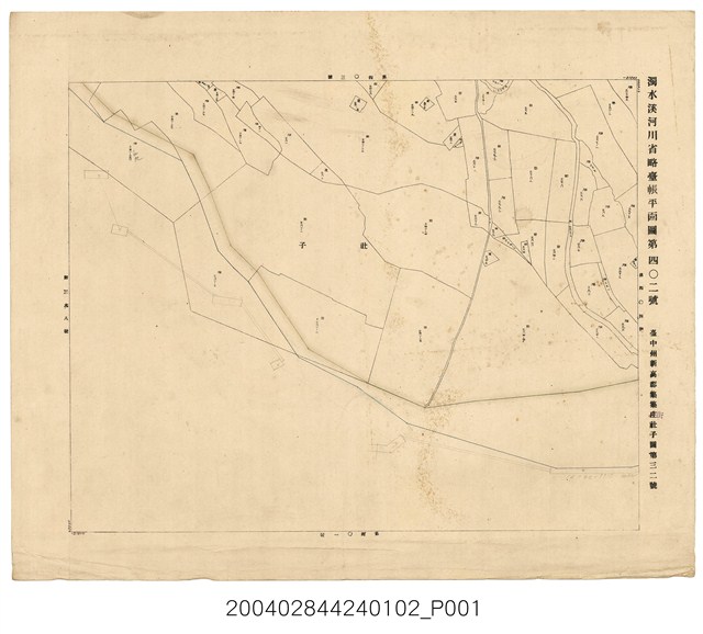 本圖為《濁水溪河川省略臺帳平面圖 》之一幅,比例尺二千五百分一,製作者臺灣總督府土木局水利課(或土木課水利股),準用河川省略臺帳平面圖之圖號為「濁水溪河川省略臺帳平面圖第四O二號」,依據地租規則之圖號為「臺中州新高郡集集街社子圖第三二號」。