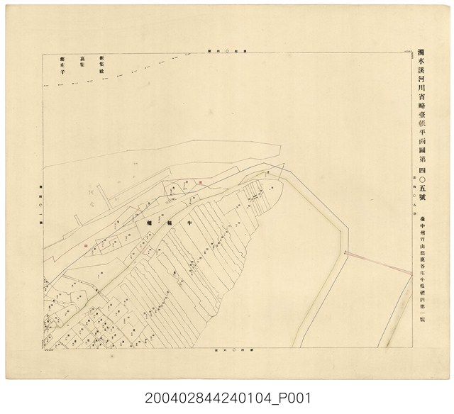 本圖為《濁水溪河川省略臺帳平面圖 》之一幅,比例尺二千五百分一,製作者臺灣總督府土木局水利課(或土木課水利股),準用河川省略臺帳平面圖之圖號為「濁水溪河川省略臺帳平面圖第四O五號」,依據地租規則之圖號為「臺中州竹山郡鹿谷庄牛轀轆圖第一號」。
