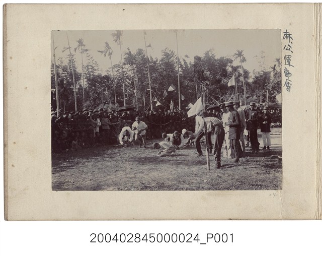 1.本物件為麻豆公學校運動會照片,為黑白照片。此為運動會其中一場賽事,比賽項目應為提著水壺競速。參賽者皆著長袖襯衫搭配短褲,赤腳在草地上。一旁圍觀的群眾應為當地居民,臉上掛滿笑容,此比賽項目應屬於娛樂詼諧的非正式項目。黏貼照片的寫真帖右方寫有「麻公運動會」字樣。本文物紙質泛黃。