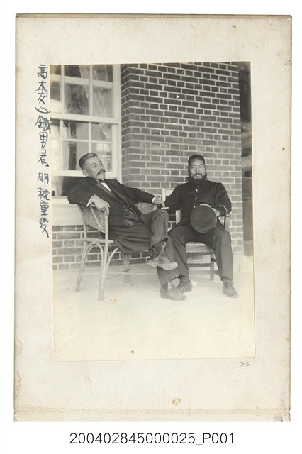 1.本物件為高木鐵男與新化公學校校長中村龜吉合照,黑白照片。合影者中,照片右方的男子,與2004.028.4500.0001的前排左方男子為同1人,穿西式文官制服,手持帽子;另1名男子身穿西式服裝。黏貼照片的寫真帖左方寫有「高木(友人)鐵男君」、「朋□重役」字樣。本文物紙質泛黃。