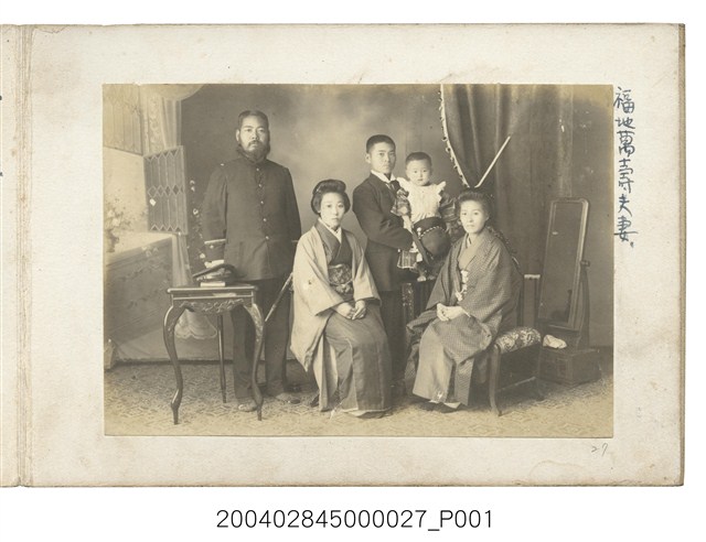 本物件為福地萬壽夫妻合影照片,為黑白照片,拍攝地點為相館。合影者中,有2名成年男子、2名成年女子與1名孩童。女子為坐姿,男子為站姿,孩童被其父親扶持站立於木架上。位於照片後排左1的男子,應與2004.028.4500.0001的前排左方男子相同。服飾方面,位於照片後排左1的男子身著成套西式文官制服;位於照片後排中間的男子身穿西式服裝;2名女子與孩童穿著和服。黏貼照片的寫真帖右方寫有「福地萬壽夫妻」字樣。本文物邊緣的紙質泛黃。