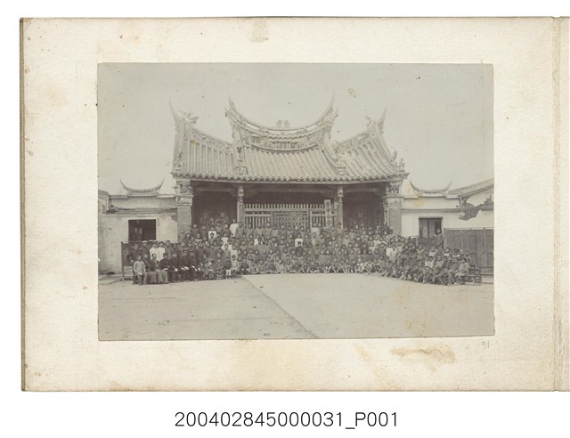 1.本物件為學甲公學校師生於學甲慈濟宮前合影照片,為黑白照片。合影者中,應為16名教職員,學童年齡級距分布較廣。服飾方面,學童皆穿著制服;6名教職員穿著西式文官制服,並佩戴帽子;2名教職員穿和服;其餘教職員穿成套服裝。在照片中央可見「學甲公學校」木牌。藉由學甲地緣及廟宇屋簷形制,推斷此廟宇應為「慈濟宮」,在廟宇的屋簷及柱頭可見交趾陶雕塑品。本文物紙質泛黃,紙張表面有些許汙跡。