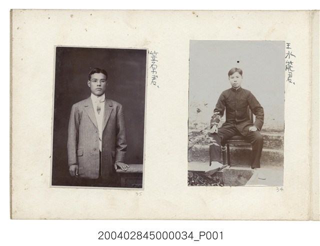 1.本物件為王水能君獨照,為黑白照片,其身著成套制服,坐在精美花紋的木椅上,此椅子與2004.028.4500.0032照片中的椅子相同,推測2張照片的拍攝地點相同。黏貼照片的寫真帖右方寫有「王水能君」字樣。本文物紙質泛黃。