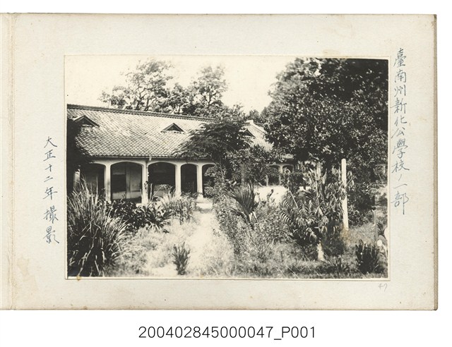 1.本物件為大正12年(1923)臺南州新化公學校一景照片,為黑白照片。此建築物應為校舍,屋頂上有3個窗,1樓為迴廊,草木繁盛的庭園有1條小徑通往校舍。黏貼照片的寫真帖左、右方寫有「大正十二年攝影」、「臺南州新化公學校一部」字樣。本文物紙質泛黃。