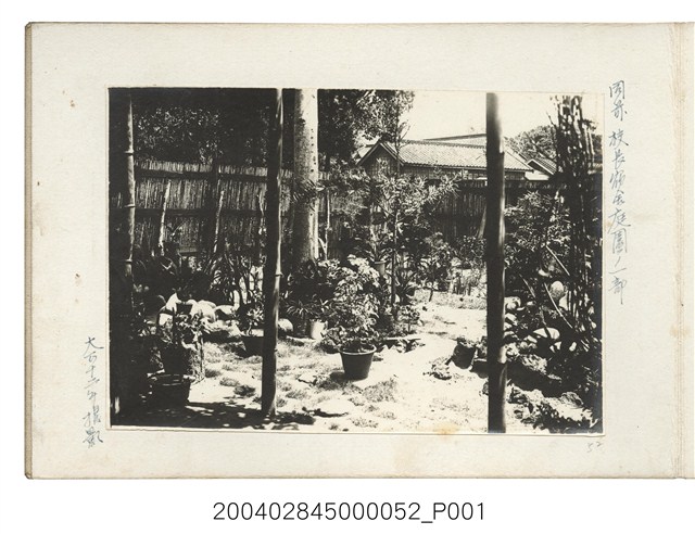 1.本物件為大正12年(1923)新化公學校校長宿舍庭園一景黑白照片,為黑白照片,拍攝地點為新化公學校校長宿舍庭園一隅。合影者中,位於照片右方的男子,與2004.028.4500.0001的前排左方男子相同。服飾方面,照片右方男子穿著西式文官制服,配戴肩章、徽章;2名女子身著和服;在女子前方蹲坐的男子穿著西式服裝。眾人四周有許多盆栽,男子身後有一整排竹籬笆。黏貼照片的寫真帖左、右方寫有「大正十二年攝影」、「同前校長宿舍庭園一部」字樣。本文物紙質泛黃。