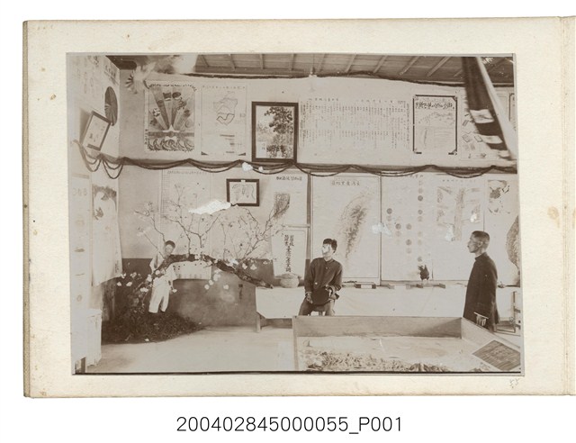 1.本物件為2名男子於新化公學校教室內照片,為黑白照片。服飾方面,2名男子皆穿著制服。教室內部可見學校教材,如「加法練習掛圖」、「公學校地理書臺灣之產業調」、「臺灣產業地圖」、「六等親血緣圖」、「新化郡模型」等,類型以臺灣產業為大宗。本文物紙質泛黃,紙張表面有破損。