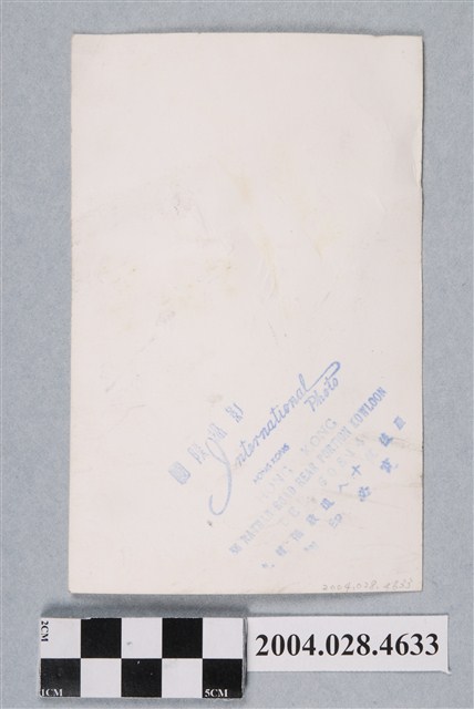 1.華語明星不詳黑白半身照片(貌似張仲文),直式單面,背景乾淨,女星一頭及肩短捲髮披於深厚,身體則被前景許多小花遮蓋,側身臉部面對前方微微一笑,看起來溫柔可愛,正面版面乾淨,下方則有一小留白版面,狀況尚可,照片背面全白,唯有拍攝地點藍色蓋印於下方版面「國際攝影」,英文字部分寫「Hong Kong」推測拍攝地點為香港,整體狀況良好。2.照片推測為女明星,其餘相關資訊不詳。