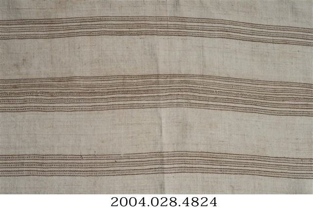 臺灣原住民中泰雅族以織布聞名,使用的材料以麻為主,以水平揹帶機(地機)為織布工具,織造出來的布料作為服裝、披肩或是被單布使用,此種簡單織紋的布料大多做為家飾布料或是被單布使用。此件織物,經紗是未經染色的麻原色(白色),緯線使用淺棕色線進行織造,織造的技法為平紋組織,是一上一下最基本的技法,在布面上構成棕、白相間的條紋效果。