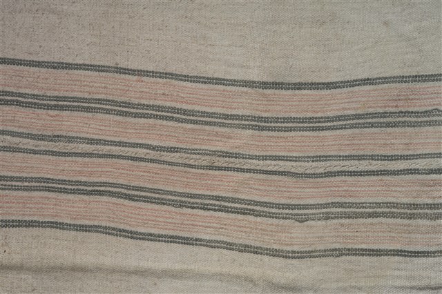 臺灣原住民中泰雅族以織布聞名,使用的材料以麻為主,以水平揹帶機(地機)為織布工具,織造出來的布料作為服裝、披肩或是被單布使用,此種簡單織紋的布料大多做為家飾布料或是被單布使用。此件織物的經紗有三種色彩,ㄧ是未經染色的麻原色(白色),以及粉橘和深灰的色線,織造的技法為平紋組織,是一上一下最基本的技法,在布面上構成色彩相間的條紋效果。 此件織背面周邊使用針線挑縫收邊,布料正面上呈現一個圓形的大污漬,推測曾經被當作桌墊布使用過。
