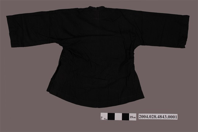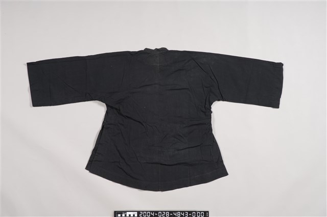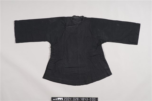 此件大襟衫以黑色棉質布料製作,服裝簡單無紋飾,立領短小、袖子寬直約七分袖,領口和大襟處共有五對直布扣,頷下一對、大襟一對、腋下及脇邊三對,並以本布做布扣紐條和打結纽頭做扣合。整件服裝以縫紉機車縫製作,在臺灣的歷史中,衣服的製作原本都是以手工縫製,1920年代才開始引用縫紉機, 於是機縫手縫並用,此件大襟衫下襬外展弧度明顯,製作簡約,判斷應該年長婦女日常的家居服。
