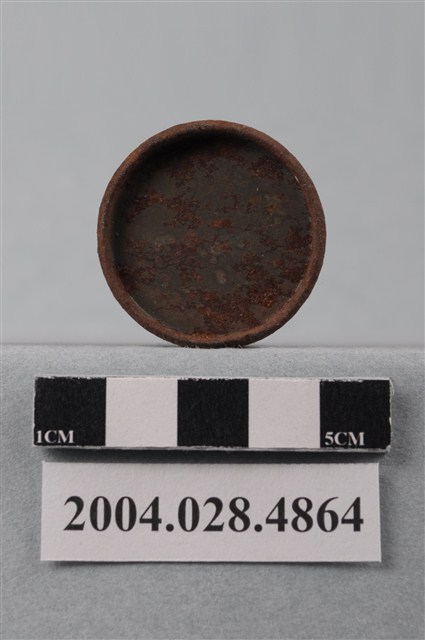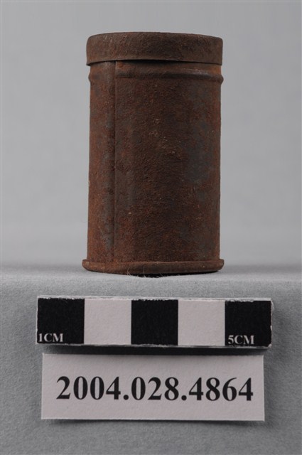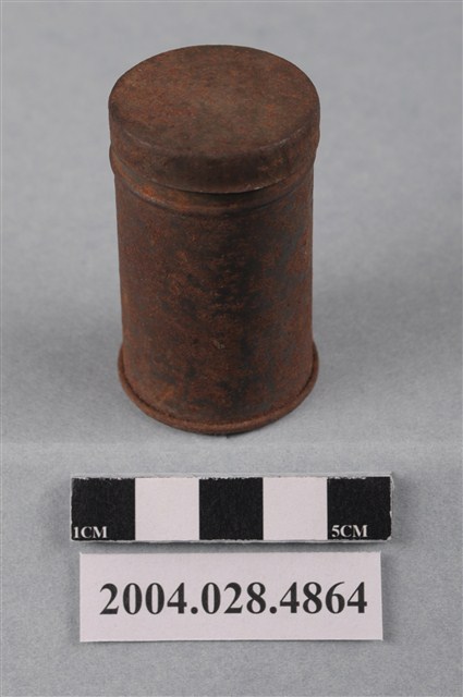 1. 本件鐵罐為底部直徑3.2公分,高5.3公分的圓柱形鐵罐,分為上蓋和圓柱形罐身兩部分,鏽蝕情形嚴重,上蓋及罐身內外皆佈滿紅棕色的鐵鏽,依稀可見罐身為黑色。2.本件鐵罐的罐蓋、罐身、罐底分別由三片鐵板製作組合成,罐身部分先將鐵板捲成圓柱形,將鐵皮接縫處焊接而形成圓筒狀,圓筒的一端與罐底的鐵板滾壓封口,最後再套上製作好的罐蓋即完成,此法製作而成的鐵罐又稱三片鐵罐,市面上十分普遍。